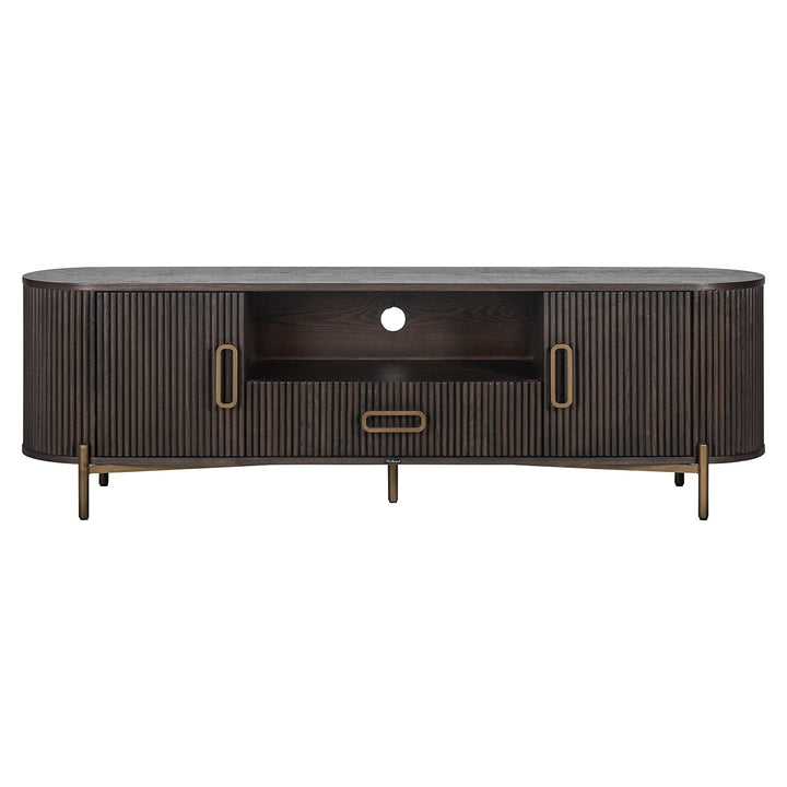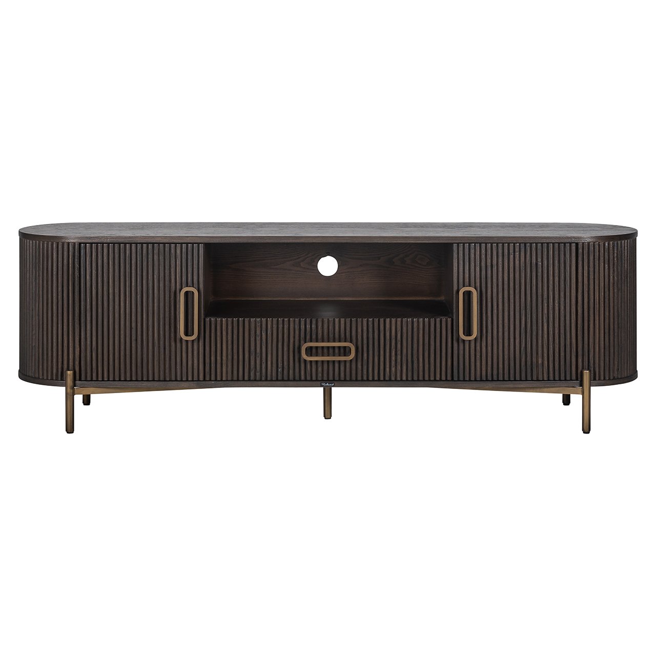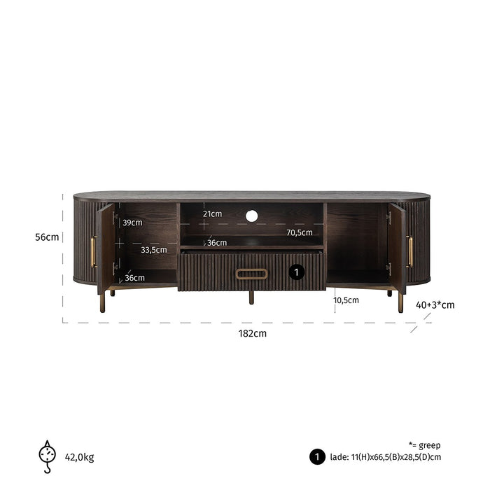 The TV-Unit Luxor 2-doors 1-drawer is the perfect addition to any living room or bedroom. With its sleek, modern design and spacious storage compartments, it is the ideal solution for organizing all of your media and entertainment equipment. The Luxor TV-Unit is constructed with high-quality iron, oak, and plywood, ensuring its durability and longevity. Its warm brown finish and clean lines provide a stylish and contemporary look that will complement any existing decor.