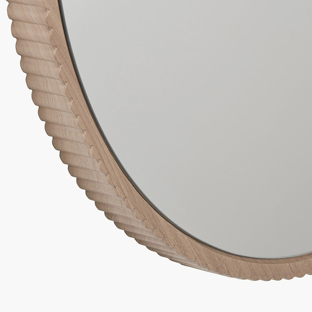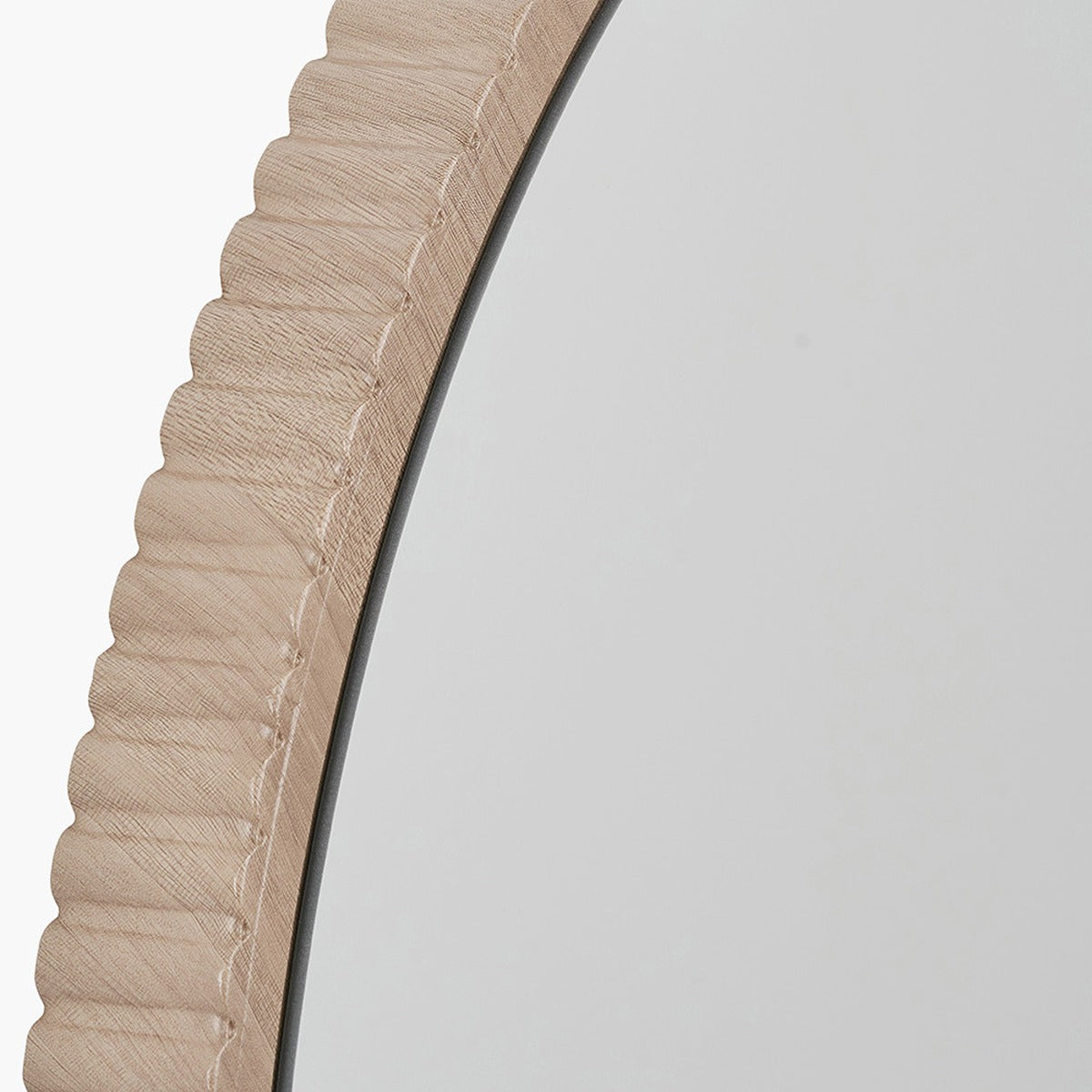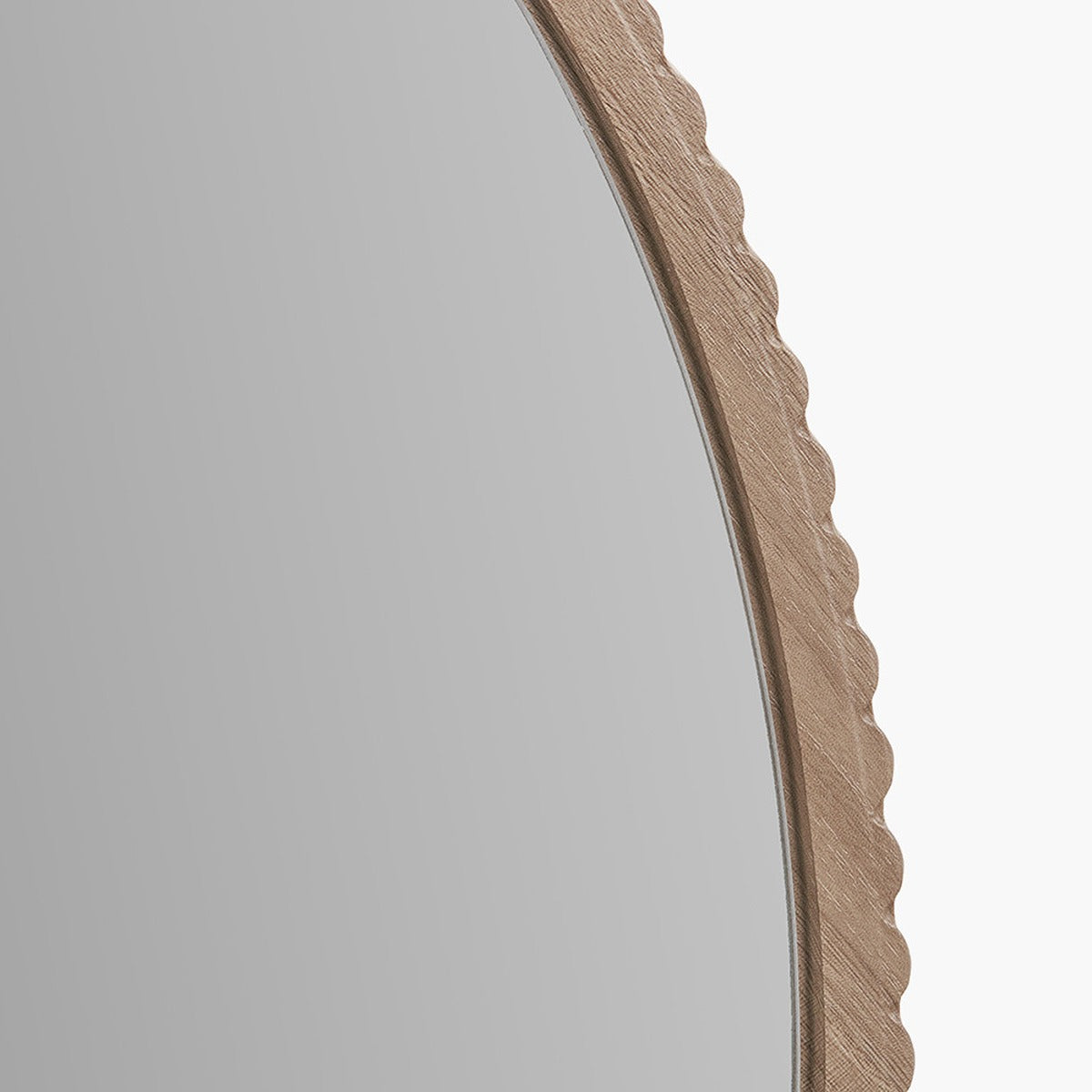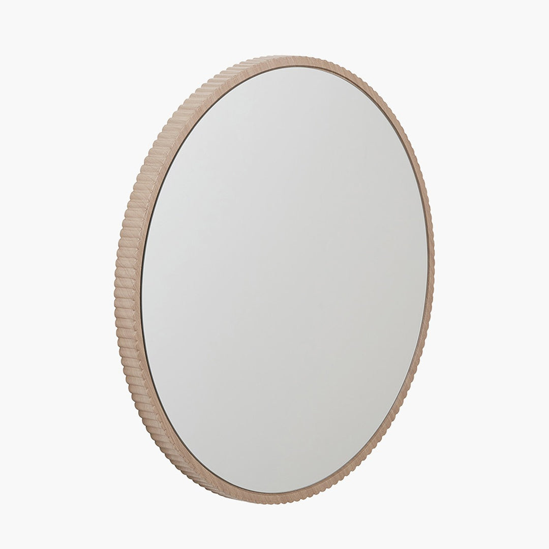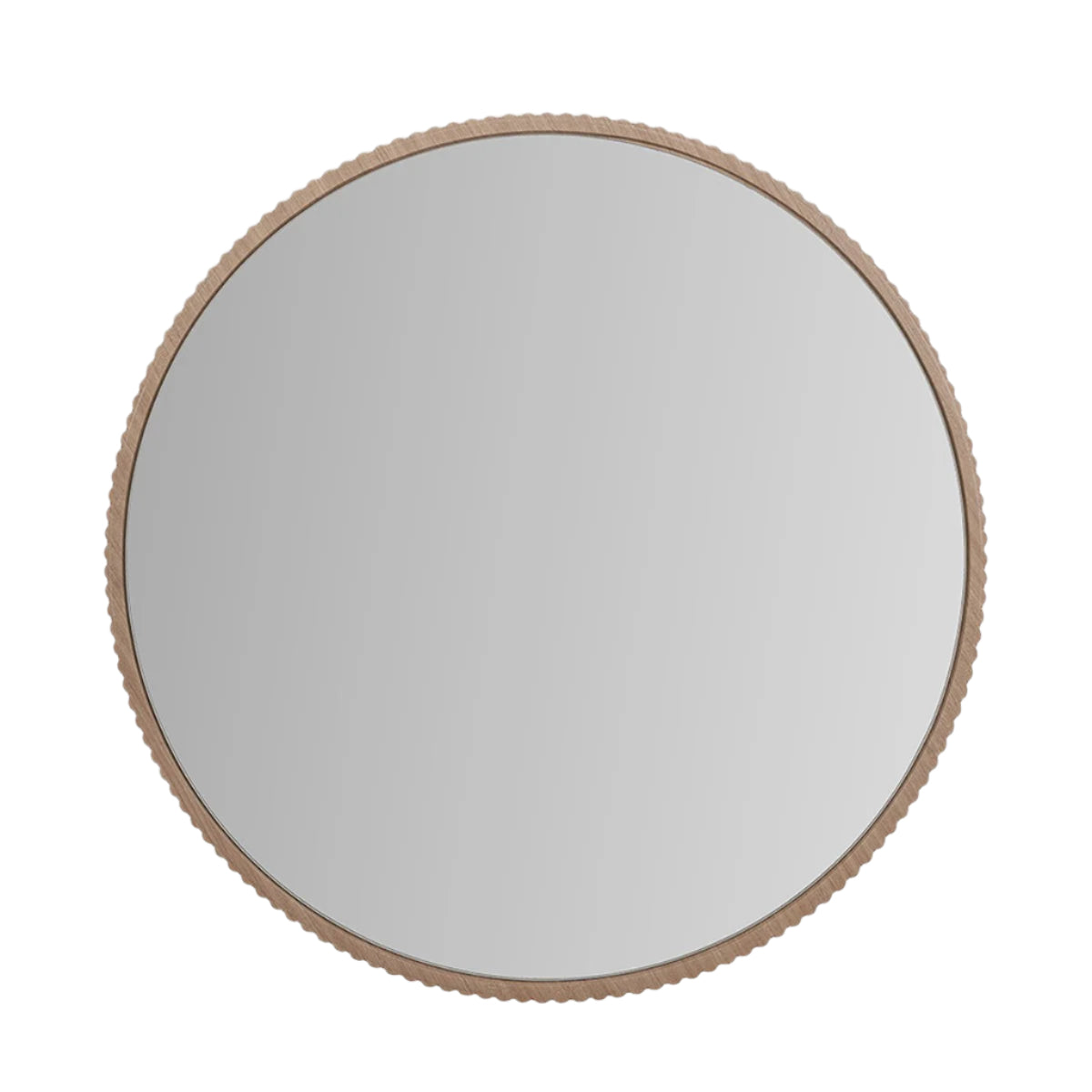 This elegant minimalist round mirror features an oak veneer frame with a stunning textured outer edge and sleek versatile design. Finished in a natural aged oak colour, this mirror perfectly compliments any interior décor. Not suitable for bathroom use.