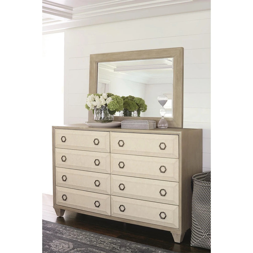 Inspired by California’s laid-back vibe and unique sense of style, the Santa Barbara dresser features a clean form, an uncommon mix of materials and a light color palette. The eight drawer fronts are wrapped in performance fabric with a faux leather look and feel. Finished in Vintage Nickel, the hexagonal pulls appear to have aged over time. Wire-brushed, cerused oak veneers are presented in a handsome tan Sandstone finish, delivering a polished yet casual feel.