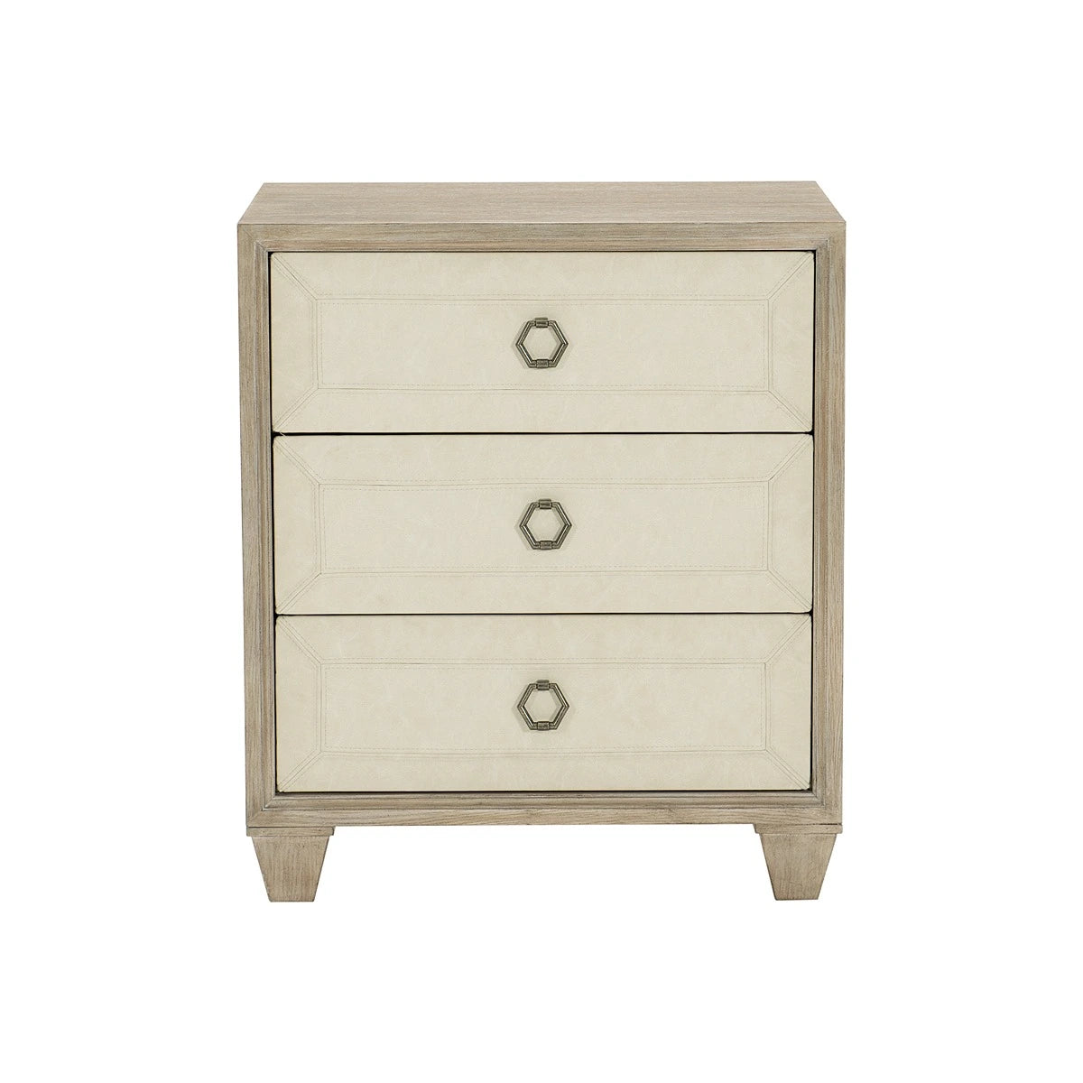 The Santa Barbara Collection offers three nightstands that share a laid-back California vibe, but each one is delightfully unique. All are small in scale, crafted with attention to detail and artistry, and capture a traditional look imbued with modernist design. This three-drawer version in warm oak features a raised drawer front wrapped in performance fabric with double needle stitching. Vintage nickel hexagonal pulls add a handsome detail.