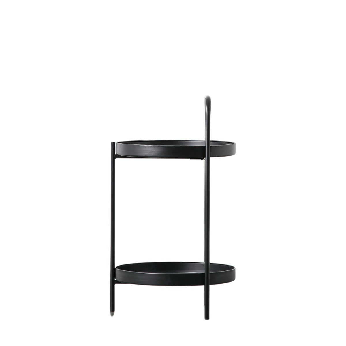 Contemporary side table crafted from metal with a black finish, with a tray-style top and lower shelf. The stunning design features a continuation of one section of the base, up and over the table to create a ‘handle’ effect. A matching coffee table is available and both are also offered in a gold leaf finish.