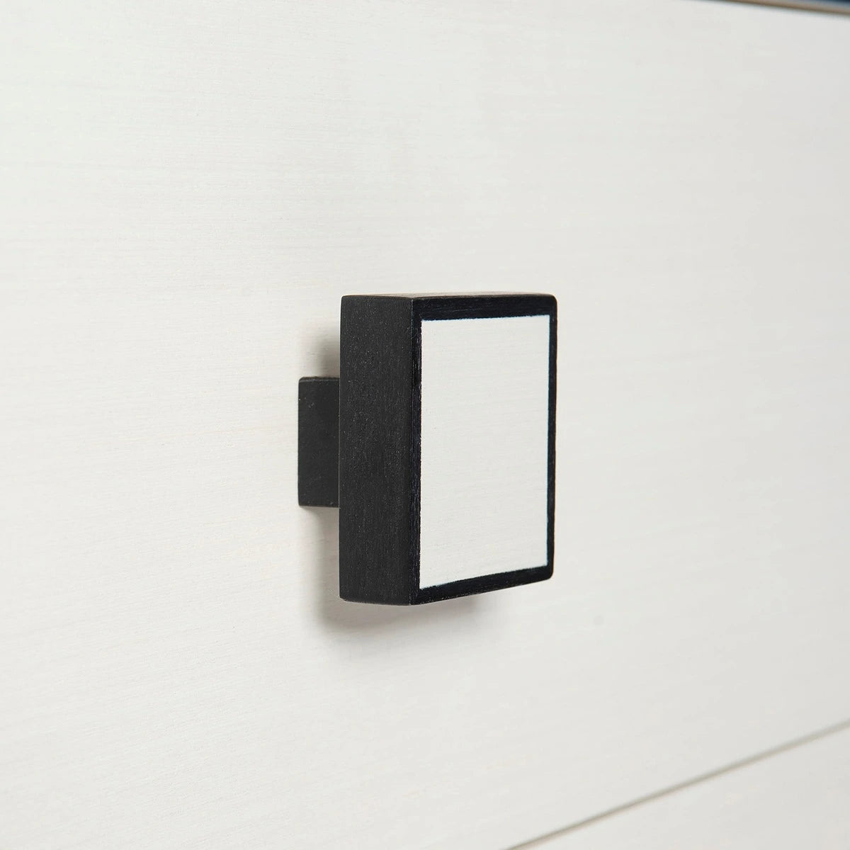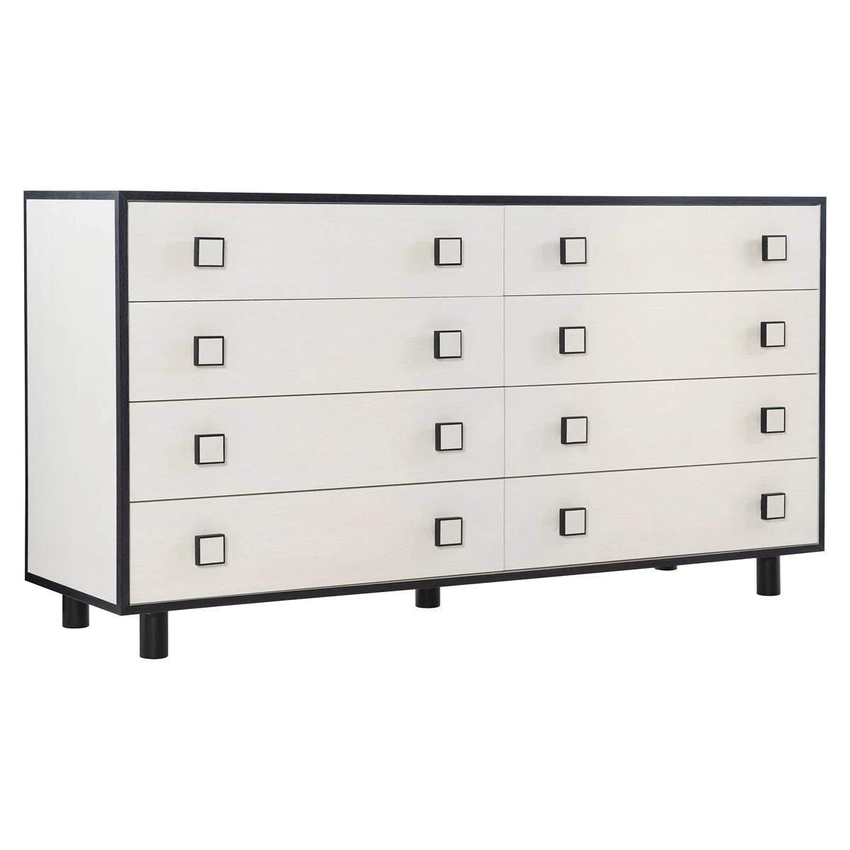 Silhouette is defined by bold contrasts, clean lines and a hint of Hollywood Regency glamour. With a chic palette of black and white, the Silhouette dresser brings a dramatic edge to a minimalist form. Finished in Eggshell, the case features eight drawers accented by square wood pulls in a two-tone finish. Borders and cylindrical feet in dark Onyx provide a striking contrast.