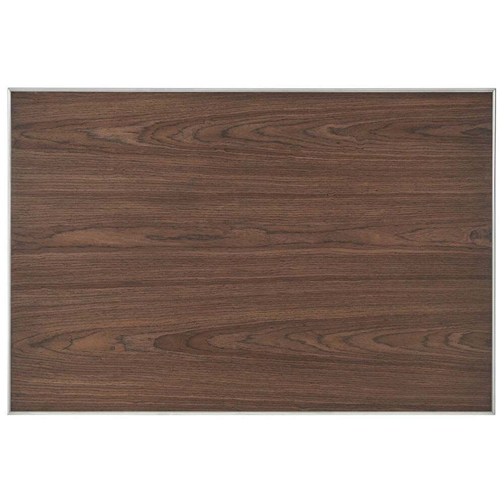 This smartly functional bedside table is perfect for contemporary bedrooms. The Blain from TA Studio by Theodore Alexander has a geometric metallic base in brushed nickel and supports a contrasting wooden cabinet with walnut grained veneer and a rich macadamia stain.