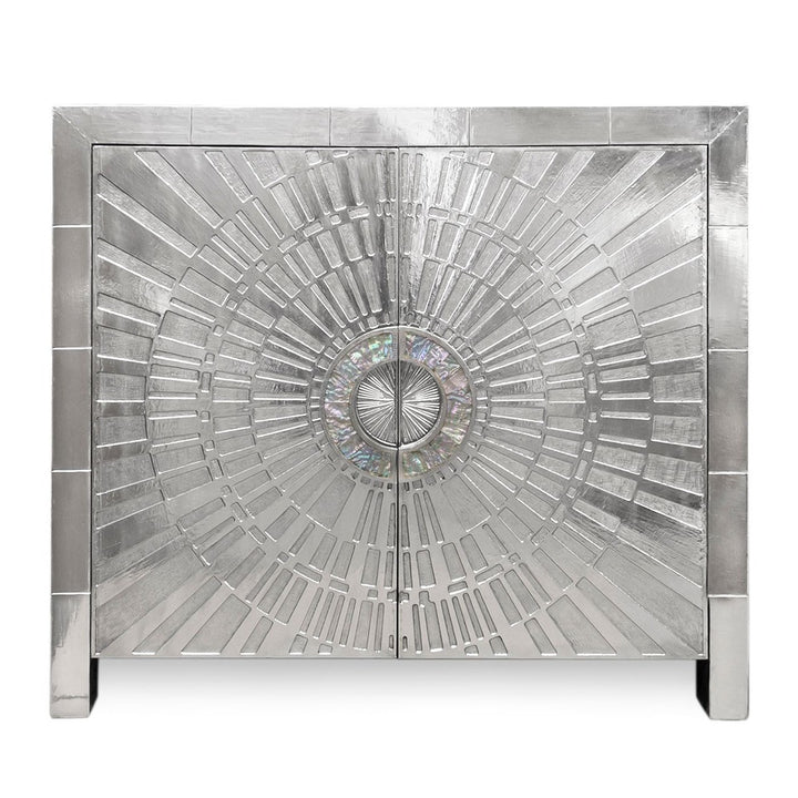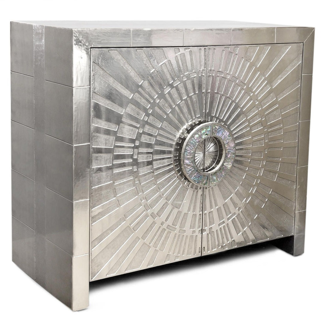 Materials: Hand-hammered nickel-plated metal applied to a wood cabinet. Natural abalone inlaid pulls (as with all natural materials, colours will vary)