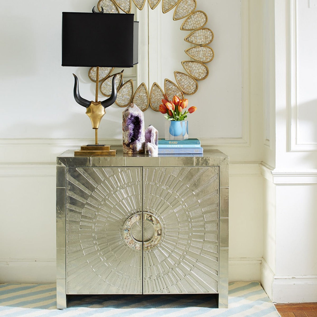 Our Talitha Cabinet features sheets of nickel-plated metal or solid brass hand-stamped into a modern starburst pattern and routed onto wood. Each is capped with jewel-like door pulls featuring a luminous, hand-cut abalone shell mosaic or naturally dazzling emerald malachite (due to the use of natural materials, colors will vary). The nickel-plated surface is reminiscent of silver leaf—it emits that same lustrous glow—while brass radiates a glowing warmth. Both are wonderfully durable. Whichever way you glow, announce your hyper-haute bona fides by using it as a buffet, flanking a doorway, or as a small dresser. Navy gloss interior with one (1) soft-slide drawer and one (1) adjustable shelf