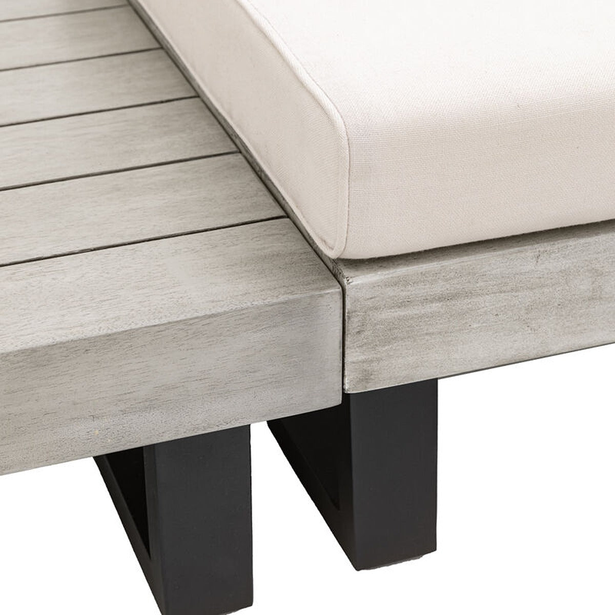 This stylish outdoor dining table features a rectangular top with a weathered acacia wood finish and striking black metal legs. The table's industrial design adds a modern edge to any outdoor space. Its sturdy construction and spacious surface make it perfect for hosting gatherings or enjoying meals al fresco. This table can be paired with matching chairs or benches to create a complete and coordinated dining set.