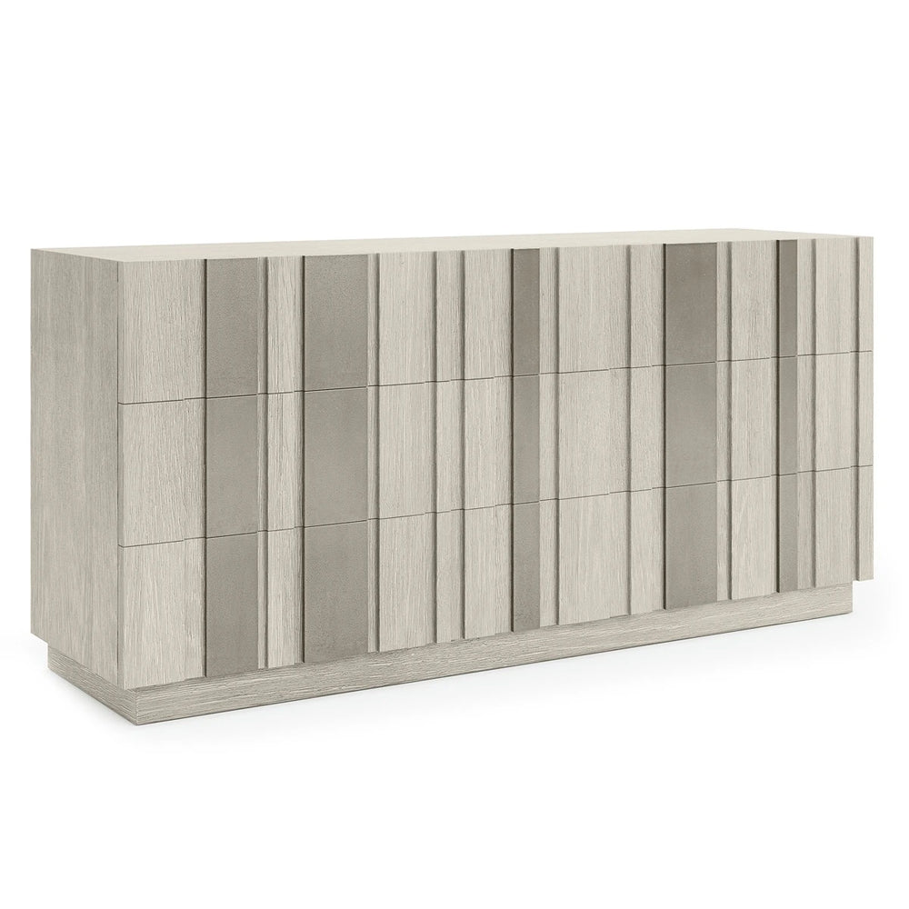 A pattern of metal and wood offers an interplay of light and shadow on the Tempo dresser. Six raised-panel drawer fronts have sandblasted aluminum overlays in Satin Nickel finish over wirebrushed oak in Larza finish. This beautiful modern dresser rests on a wood plinth base.