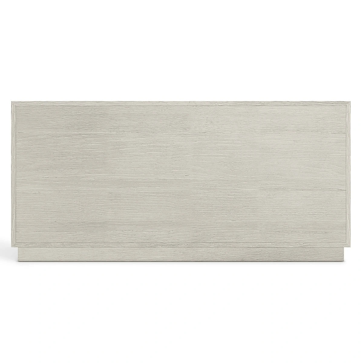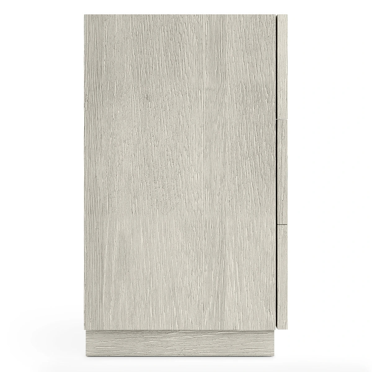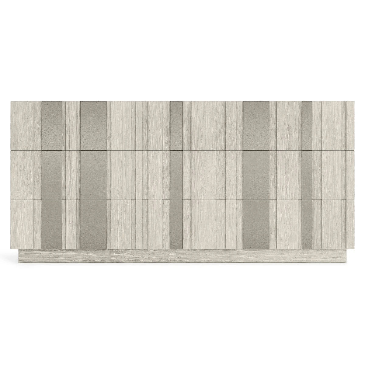 Additional Information: Wirebrushed oak in Larza finish with smooth top and raised panel drawer fronts with random sandblasted aluminum overlays in Satin Nickel finish Six push-to-open drawers Plinth base Adjustable glides Anti-tip kit Not suitable for use with TV Specifications subject to change without notice