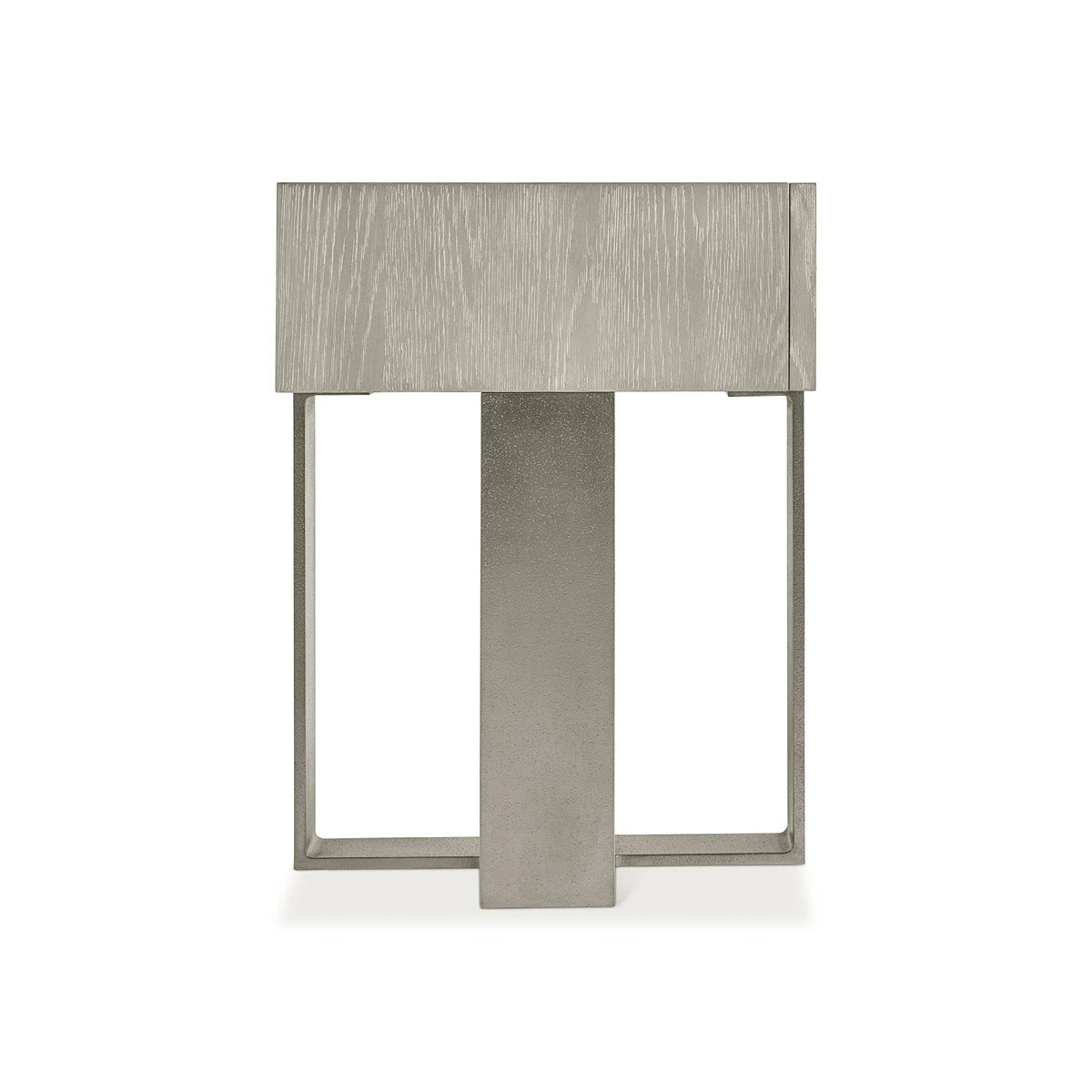 Bands of sandblasted aluminum intersect to form the base of the Tempo nightstand. One band extends over the nightstand's drawer front to give it an architectural look. The top adds a casual note in wirebrushed oak finished in Larza. High-tech details include a two-port A+C USB charging unit.