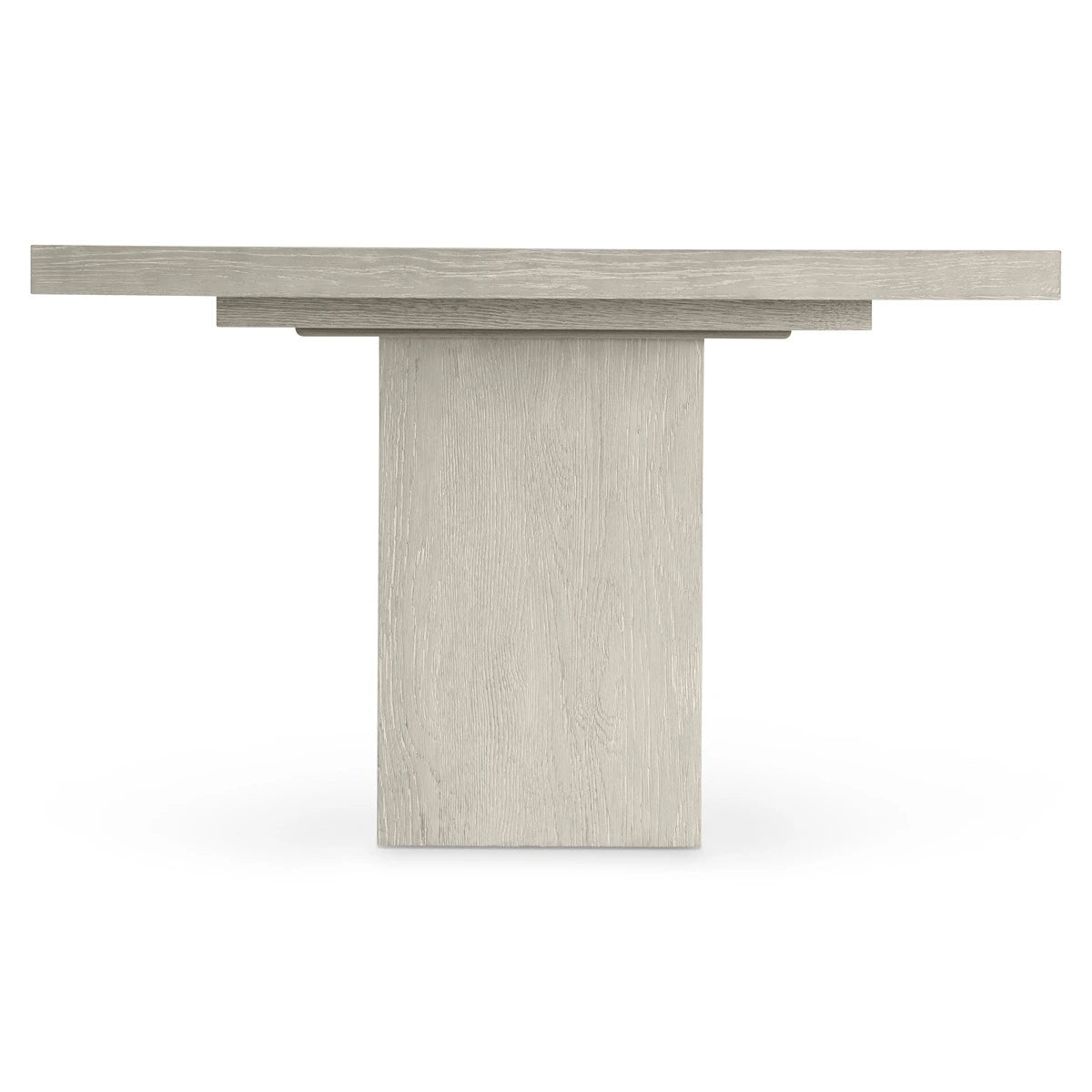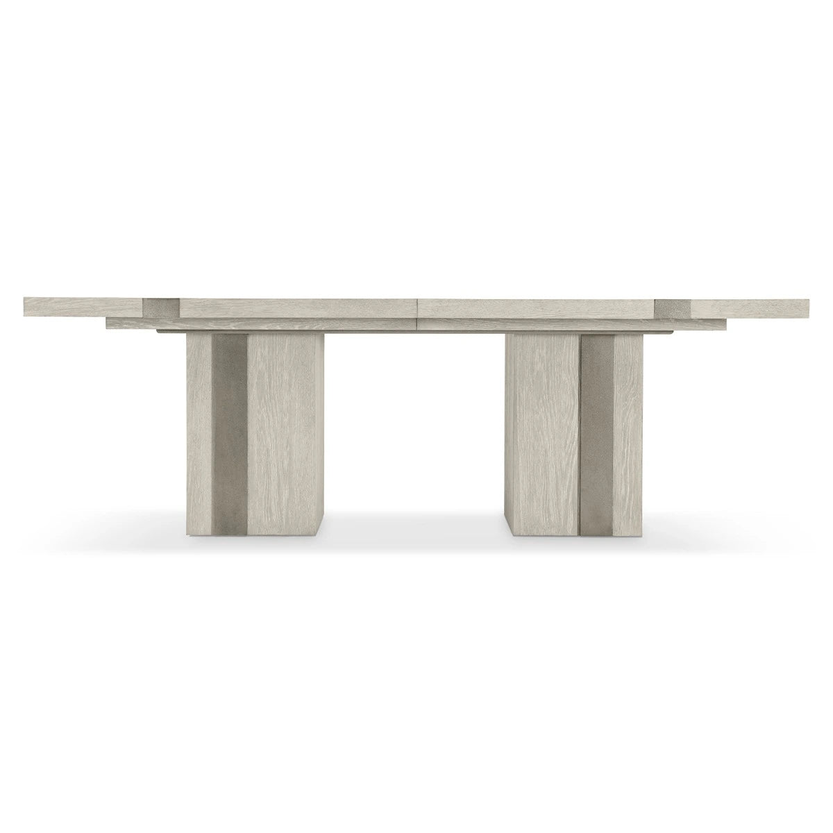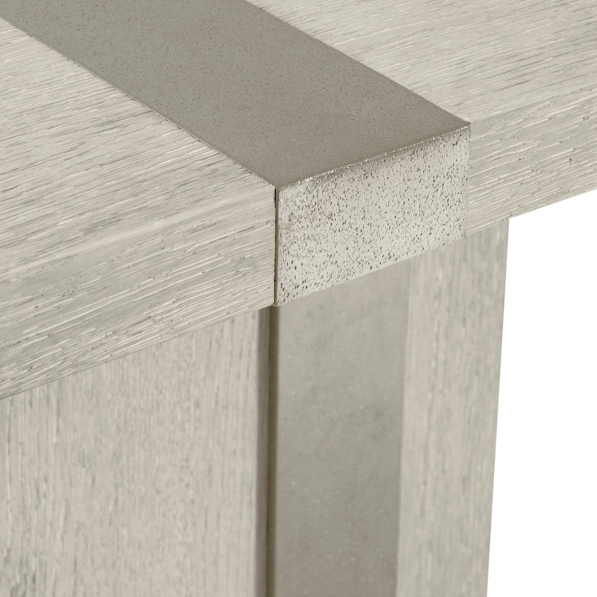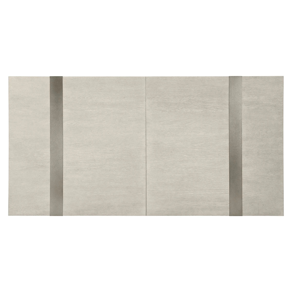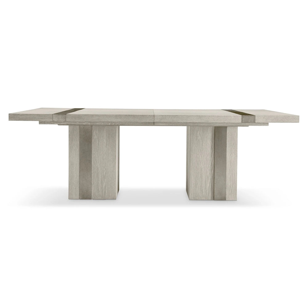 Bands of sandblasted aluminum wrap overlay the wirebrushed oak on the Tempo dining table. The double pedestal base and top are finished in the light, Larza finish that perfectly balances the Satin Nickel finish on the metal. The top offers a modern style with its overlaid metal bands across each end of the table.