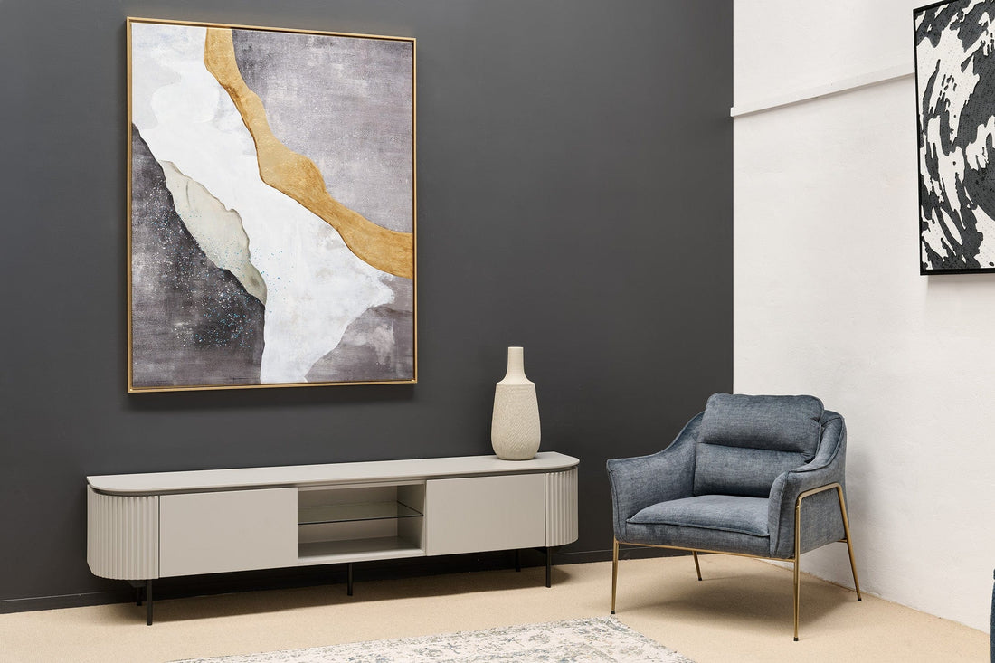 Exuding an air of refined elegance, the Lantine TV Unit in beige lacquer stands as the epitome of chic design. Its distinctive ribbed end panels infuse a touch of texture and artistry, while the matte glass top adds a layer of sophistication to the piece. Supported by sleek black powder-coated legs, the unit maintains a contemporary edge that complements various interior styles. Practicality meets style with one middle glass shelf for media devices and two cupboards for concealed storage, providing an organized solution to keep your space clutter-free. Measuring 2 meters in length, the Lantine TV Unit marries form and function seamlessly, transforming any living area into a harmonious haven of tasteful aesthetics and modern utility.