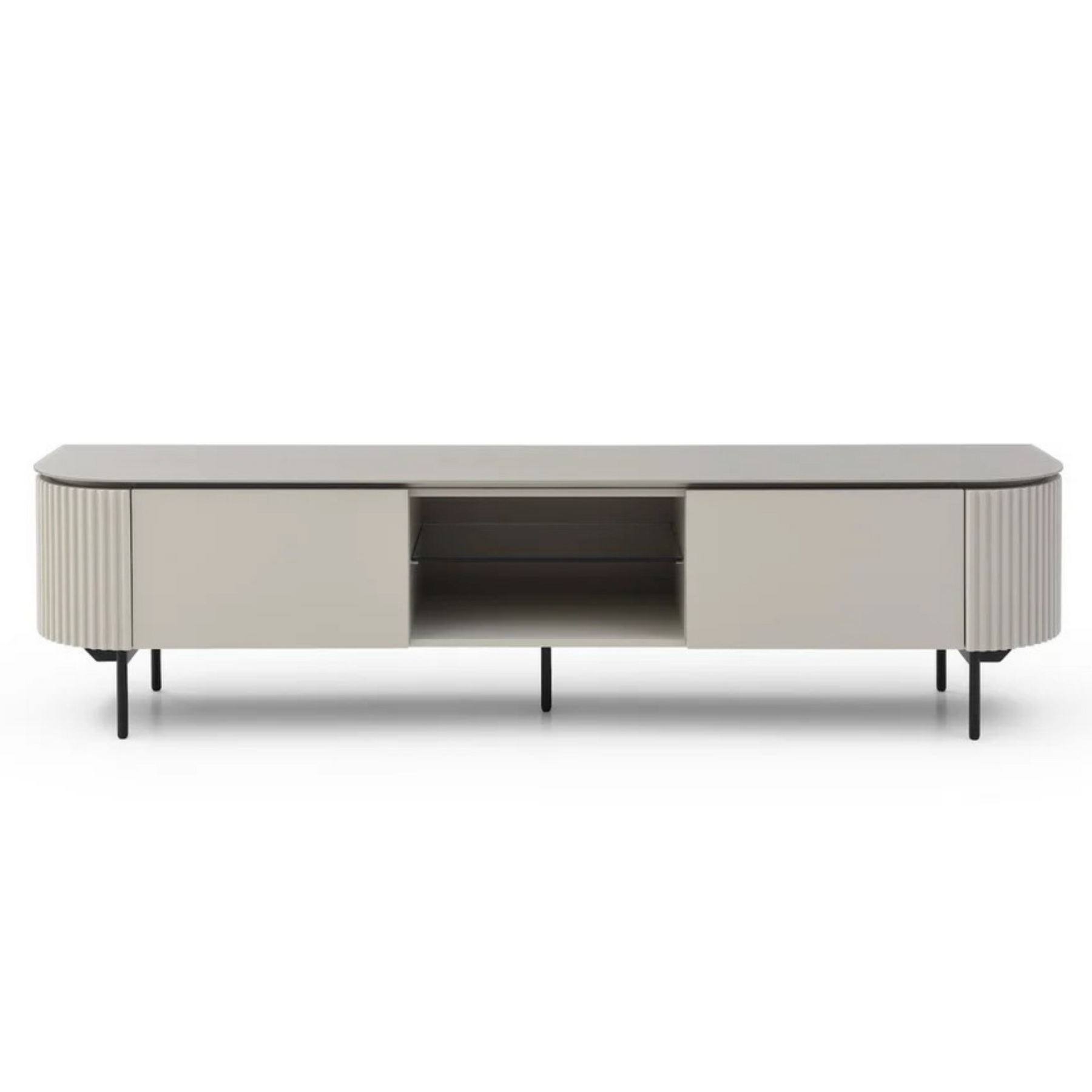 Exuding an air of refined elegance, the Lantine TV Unit in beige lacquer stands as the epitome of chic design. Its distinctive ribbed end panels infuse a touch of texture and artistry, while the matte glass top adds a layer of sophistication to the piece. Supported by sleek black powder-coated legs, the unit maintains a contemporary edge that complements various interior styles. Practicality meets style with one middle glass shelf for media devices and two cupboards for concealed storage, providing an organized solution to keep your space clutter-free. Measuring 2 meters in length, the Lantine TV Unit marries form and function seamlessly, transforming any living area into a harmonious haven of tasteful aesthetics and modern utility.
