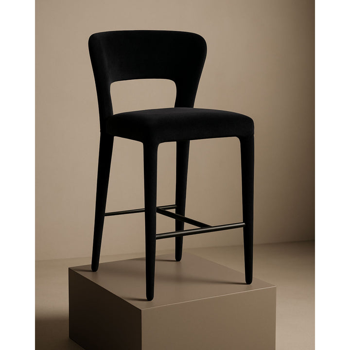Fully upholstered in sumptuous black vanity velvet, the Pari I Bar Stool offers a touch of opulence and indulgence for any contemporary space. With its simple yet refined shape, the Pari I Bar Stool exudes an air of understated elegance that perfectly complements various interior design styles. Whether placed at a home bar or a stylish kitchen island, this bar stool becomes a captivating centerpiece that elevates the ambiance of any space. Beneath its elegant exterior lies an interior metal frame that ensures durability and stability, providing reliable support for years to come. The combination of the lustrous black vanity velvet and the sleek lines of the metal frame creates a stunning visual contrast, adding a touch of modern allure to the stool's overall aesthetic.