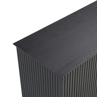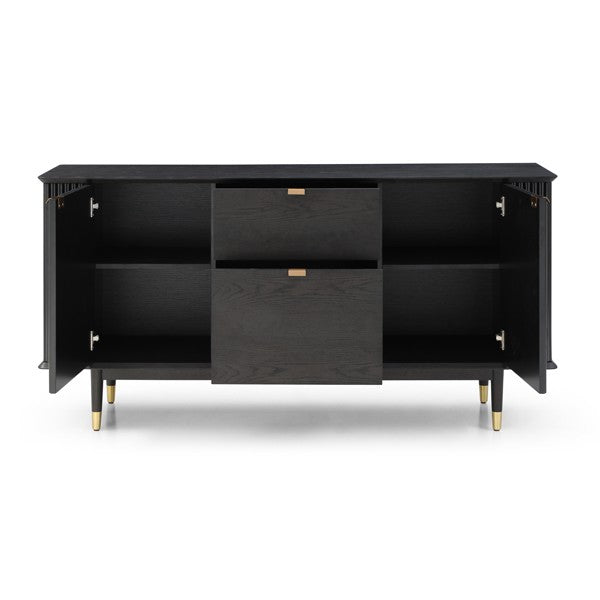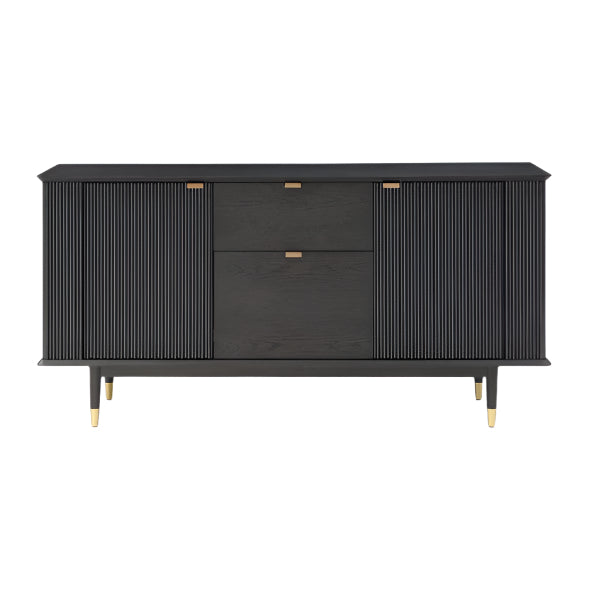The Rhodes Buffet is a stylish and modern storage solution, perfect for any home. Crafted from high-quality smoked oak veneer, the buffet features ribbed sides and two full-height cupboards, with doors finished in a classic Matte black colour. Polished brushed brass handles and leg cap detailing add the perfect touch of elegance. Inside, two large drawers offer plenty of storage space, ensuring you have enough room for all your essentials. Whether it's in the dining room, living room, or bedroom, the Rhodes Buffet will bring effortless sophistication to your home.