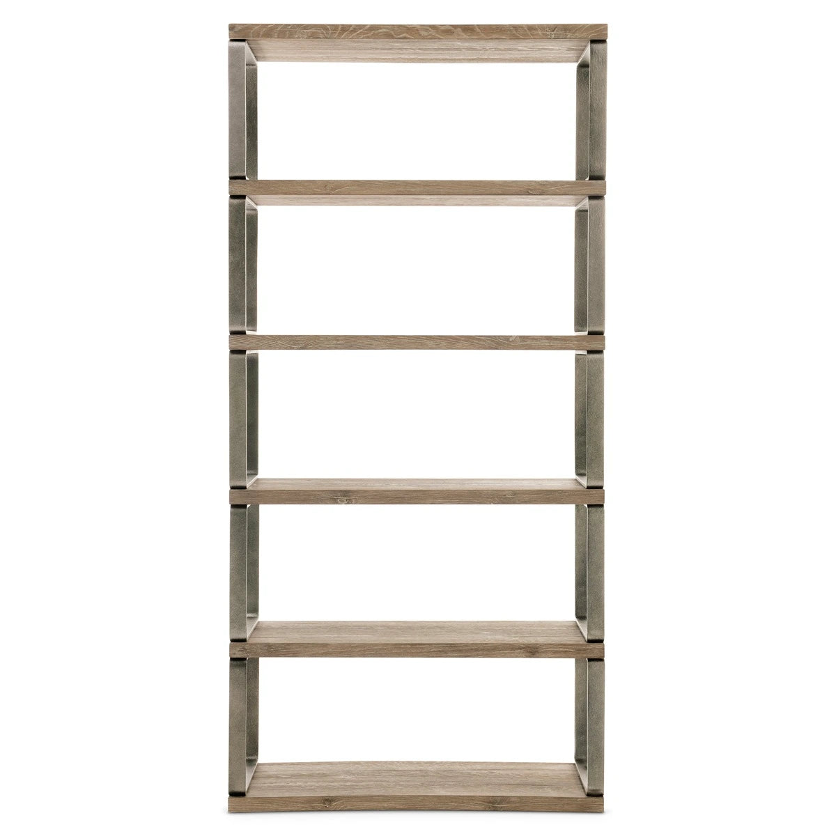 Additional Information: White oak solids and veneers in Aurum finish with applied texture steel frame supports in Barlow finish Five fixed shelves Adjustable glides Anti-tip kit Natural characteristics in the wood are a normal part of the Aurum finish and make each piece unique