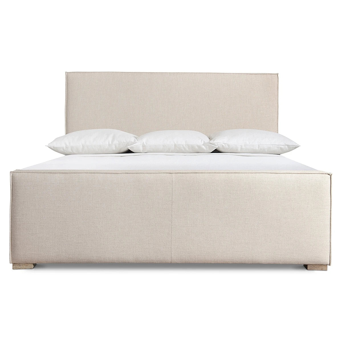 The Tribeca panel bed crafts a modern organic look with an upholstered headboard and footboard that feature unique double welt flanges. The side rails are also upholstered, softening the sleek straight lines of the design. Four wood feet are finished in Aurum.