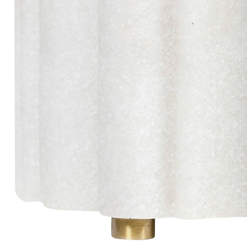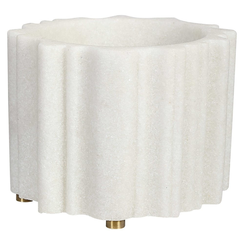 An unexpected and delightful shape provides a statement piece that has many purposes, and is the perfect place to showcase an orchid or other favorite plant. Crafted from ivory man-made stone that accurately replicates the look of Thassos marble.