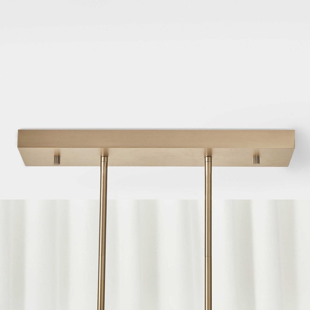 Twelve trumpets of seeded art glass emit a welcoming spread of light on an oversized linear pendant. Shades are attached to tapered brass caps and the round bar is suspended by two adjustable-length rods. Supplied with 20' wire, 6-12" stems and 2-6" stem for adjustable installation with 12-60 watt LED max candelabra sockets.