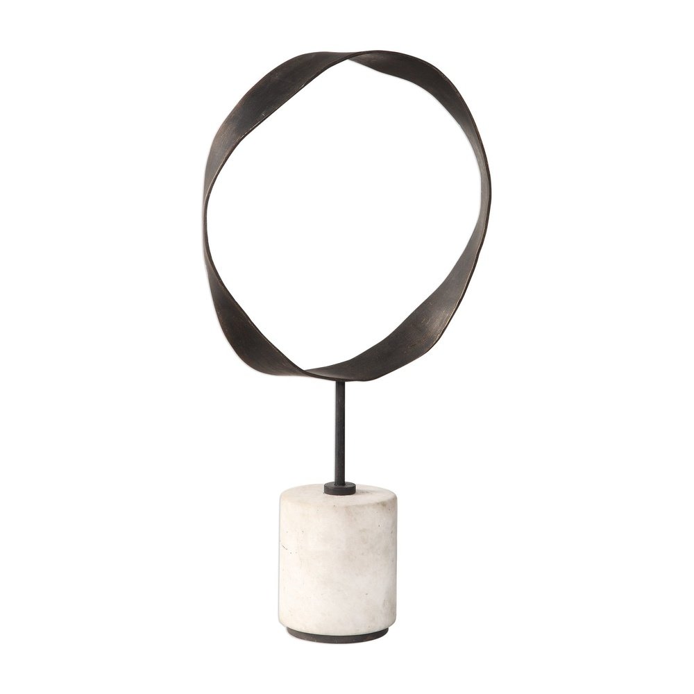 Cast metal ring sculpture with an antique bronze finish and gold highlights, set on a white marble cylinder base.