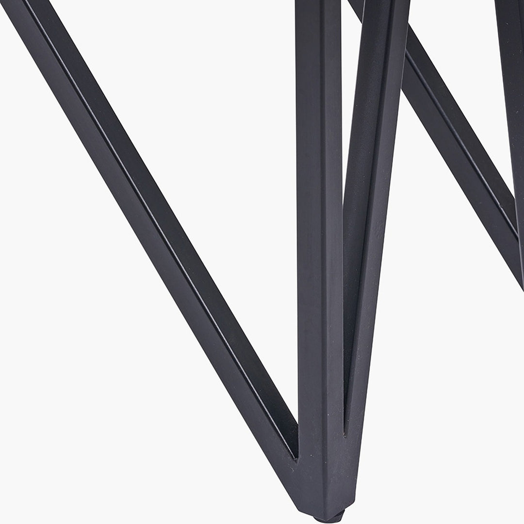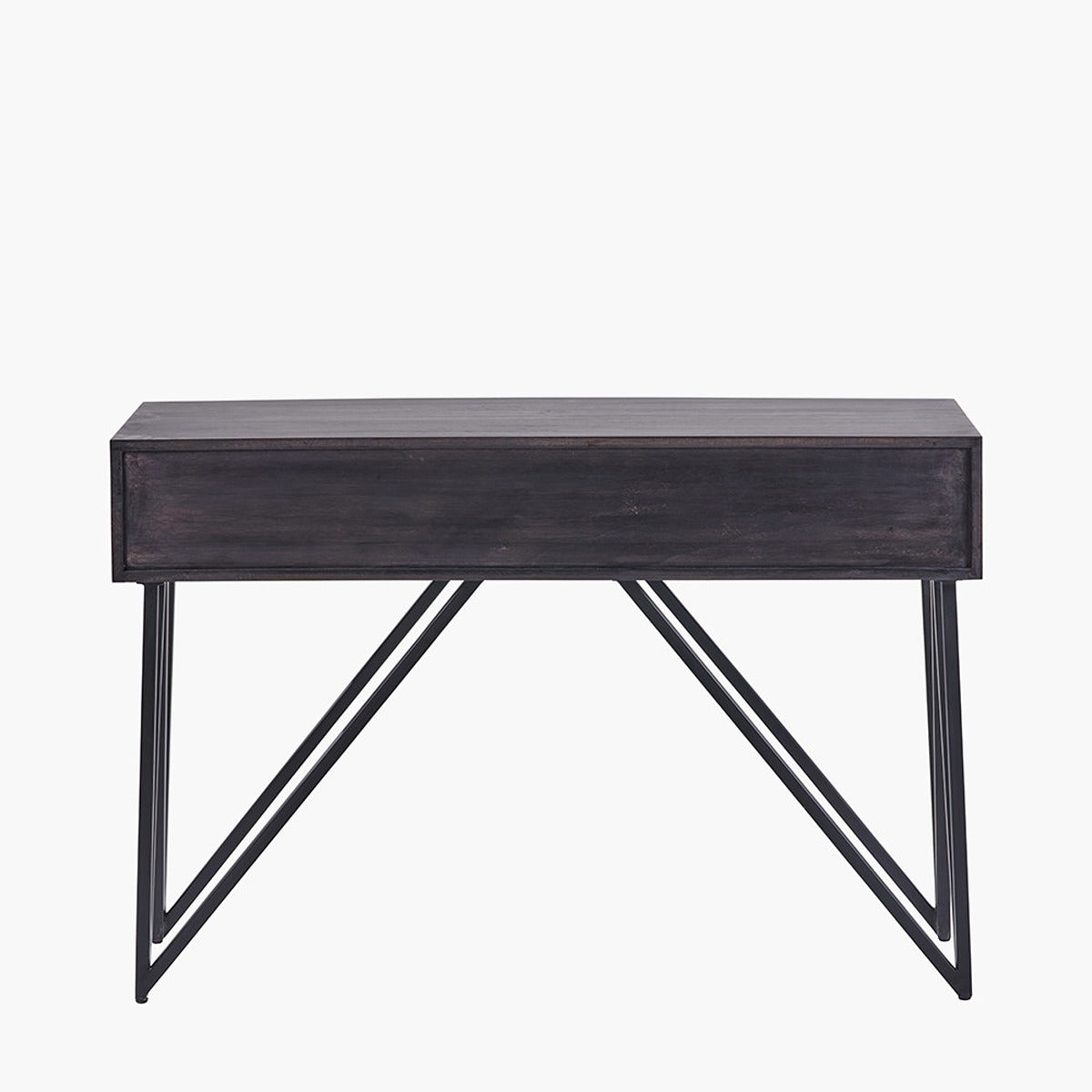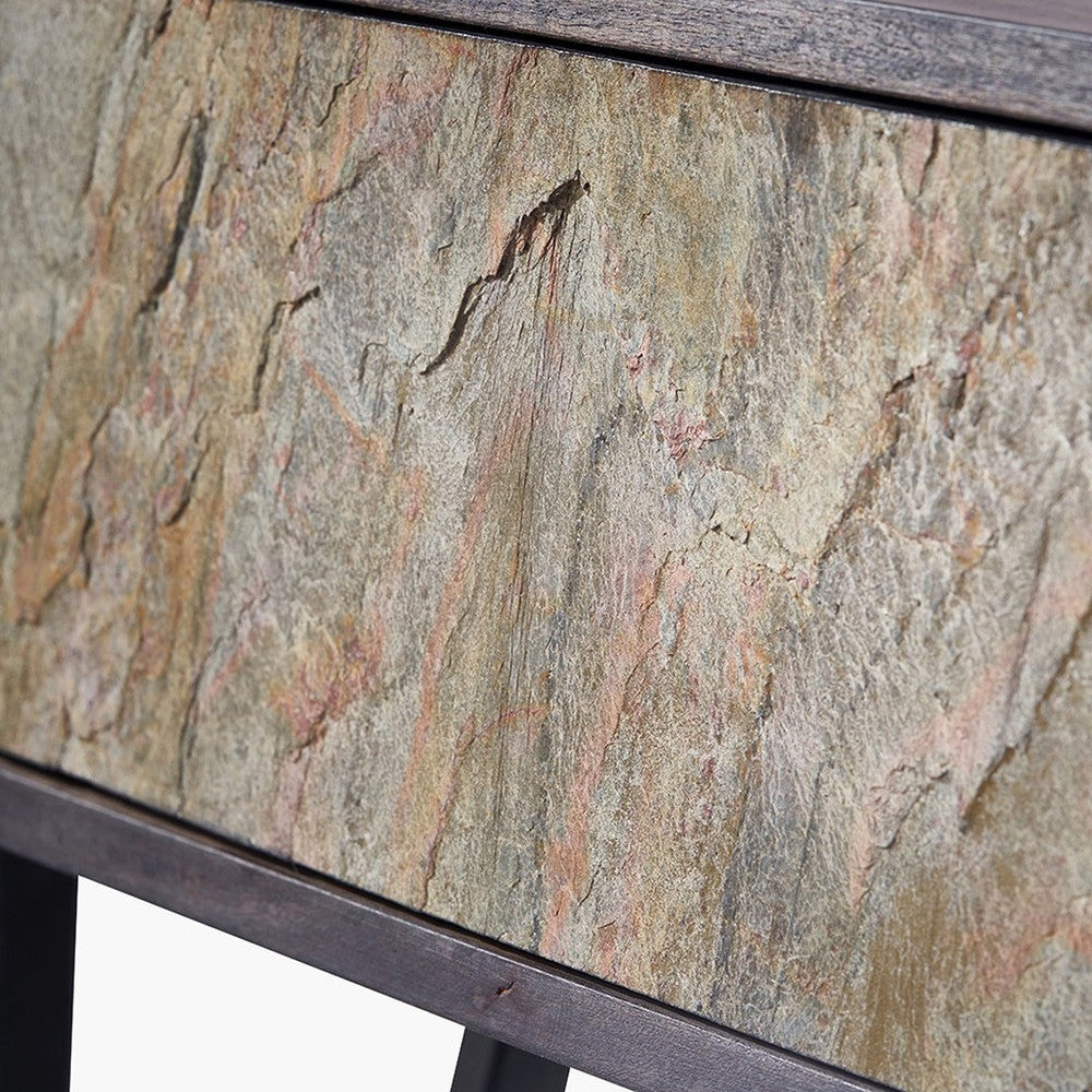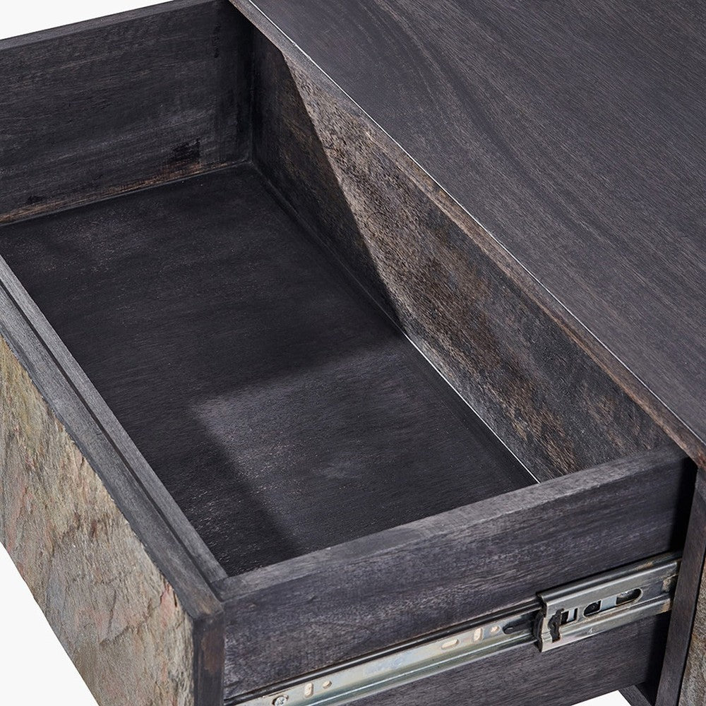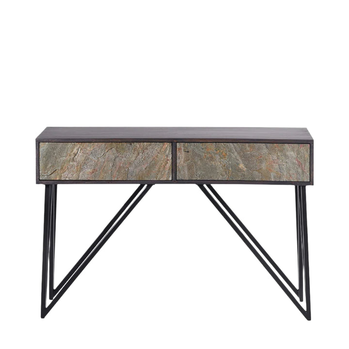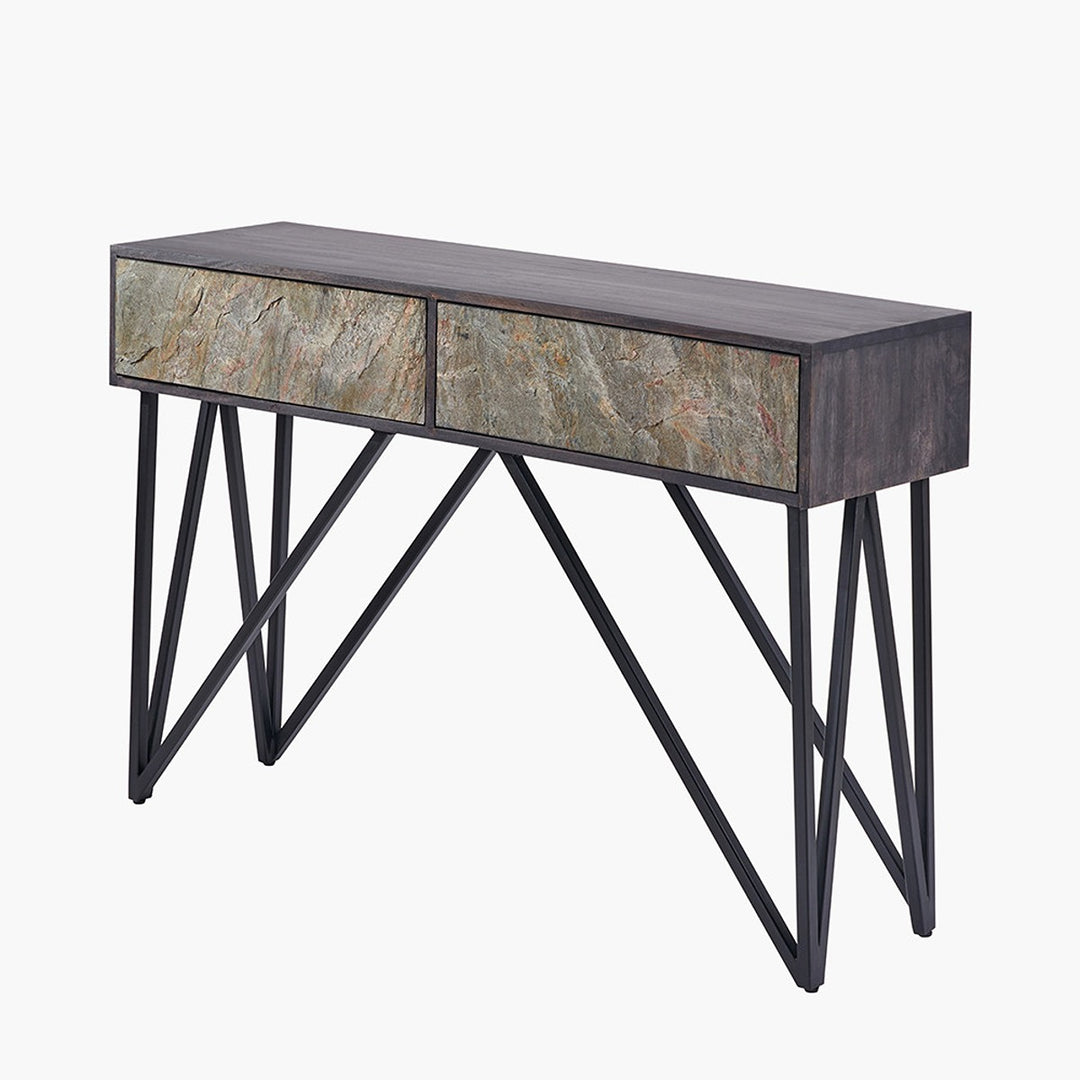 This eye-catching black and stone console table from the Venti collection is expertly handcrafted in India from mango wood. It features a sleek black finish that beautifully frames the stone veneer two-drawer front, creating a bold contrast that makes this mango wood console table standout in any room.