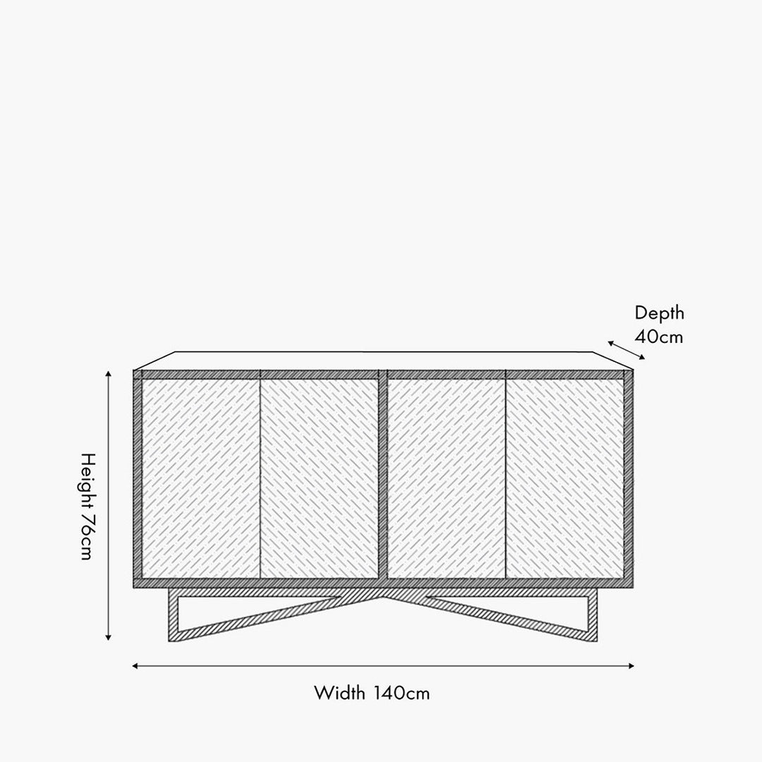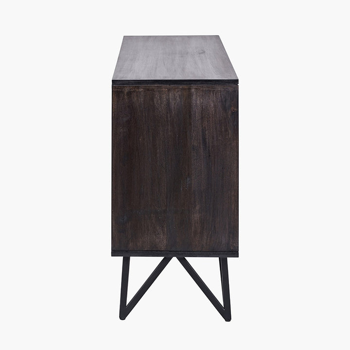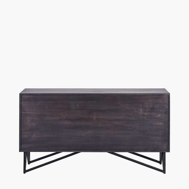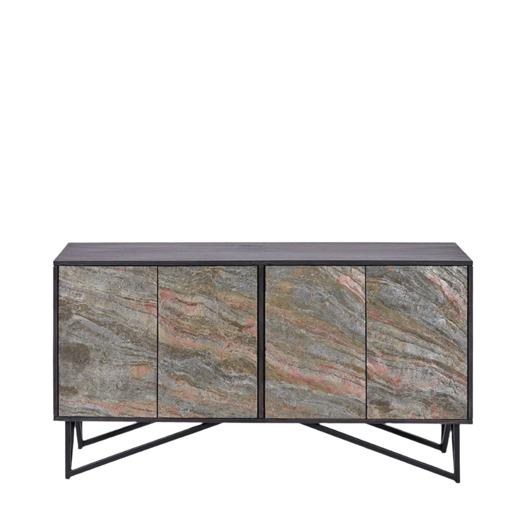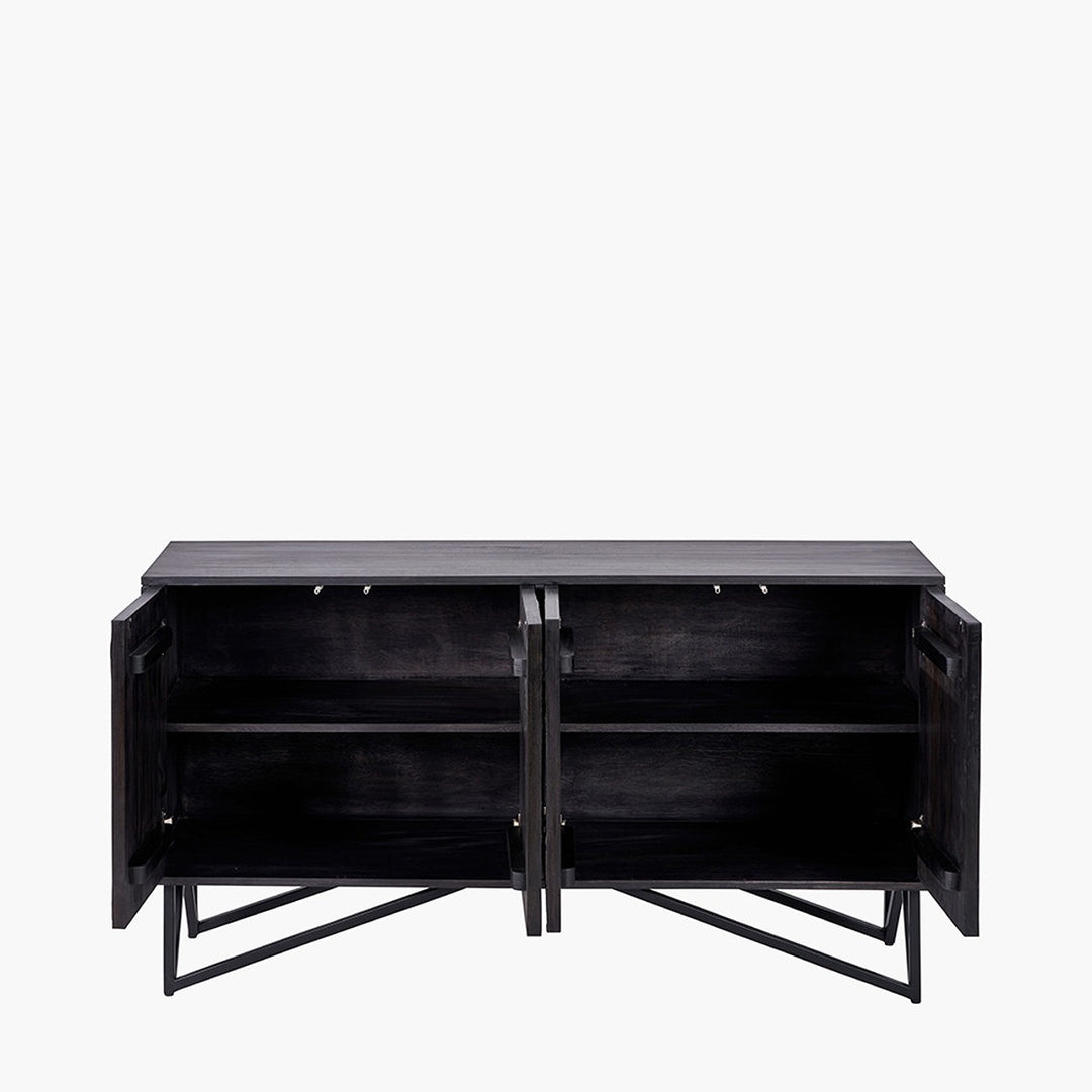 Enhance your space with the stunning four-door black sideboard from the Venti collection. Expertly crafted in India, this exquisite piece features mango wood in a black finish with a striking stone veneer on the door fronts, creating a beautiful contrast. The stone veneer lends an industrial touch, making this mango wood sideboard a perfect addition to any interior.