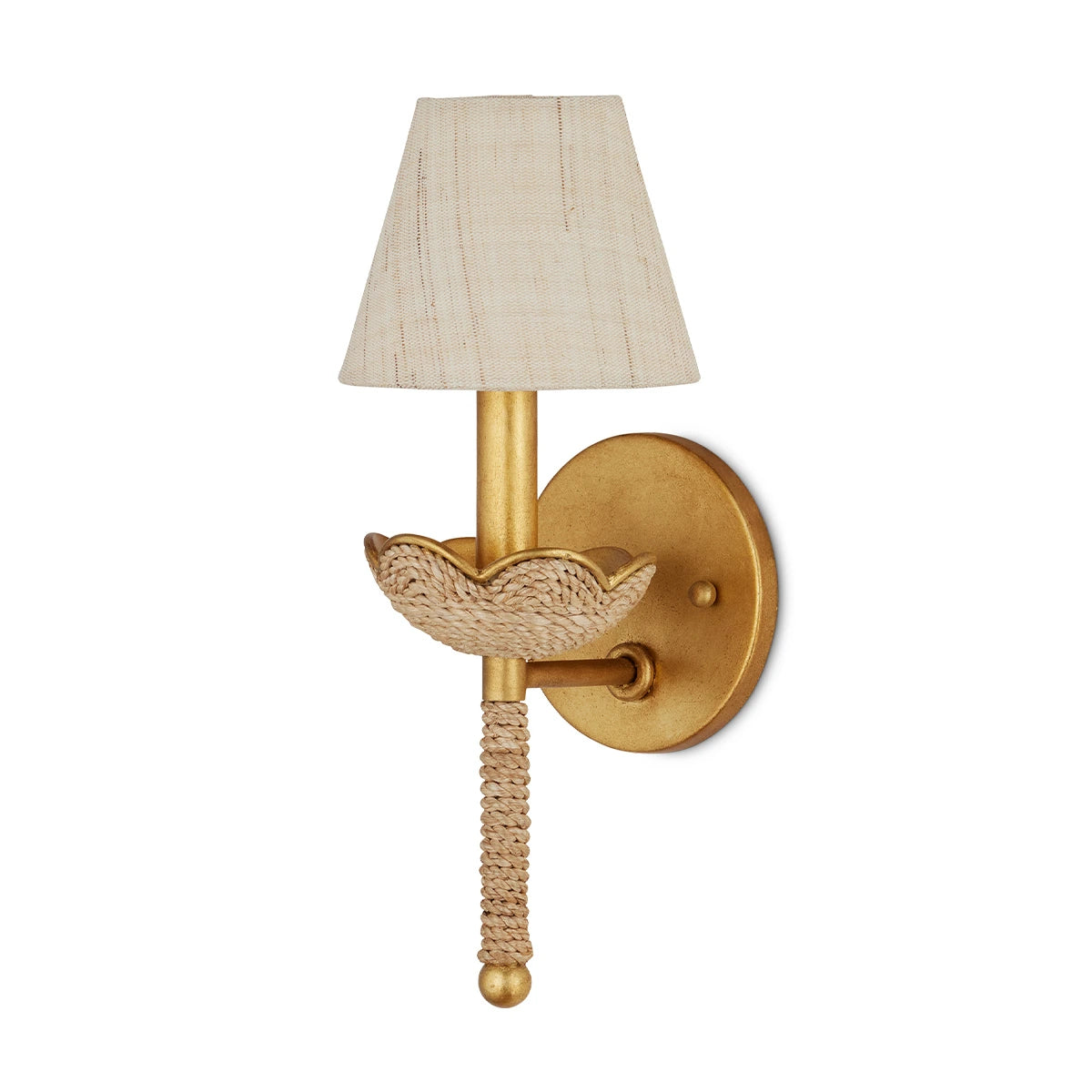 The Vichy wall sconce was created by Suzanne Duin, who is known for a keen eye in sourcing authentic French antiques and home accessories from around the globe. Each piece in her line of woven light fixtures is handmade by artisans in Southeast Asia; the Vichy an example in abaca rope and steel in a mix of contemporary gold leaf and contemporary gold finishes. The finely shaped braided edges reflect Parisian style, and the overall composition brings both texture and French flair.