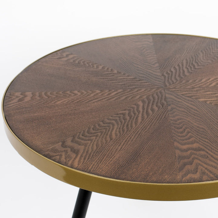 Materials: MDF table top with ash wood veneer in a walnut colour finish (stained & lacquered) and gold painted iron.
