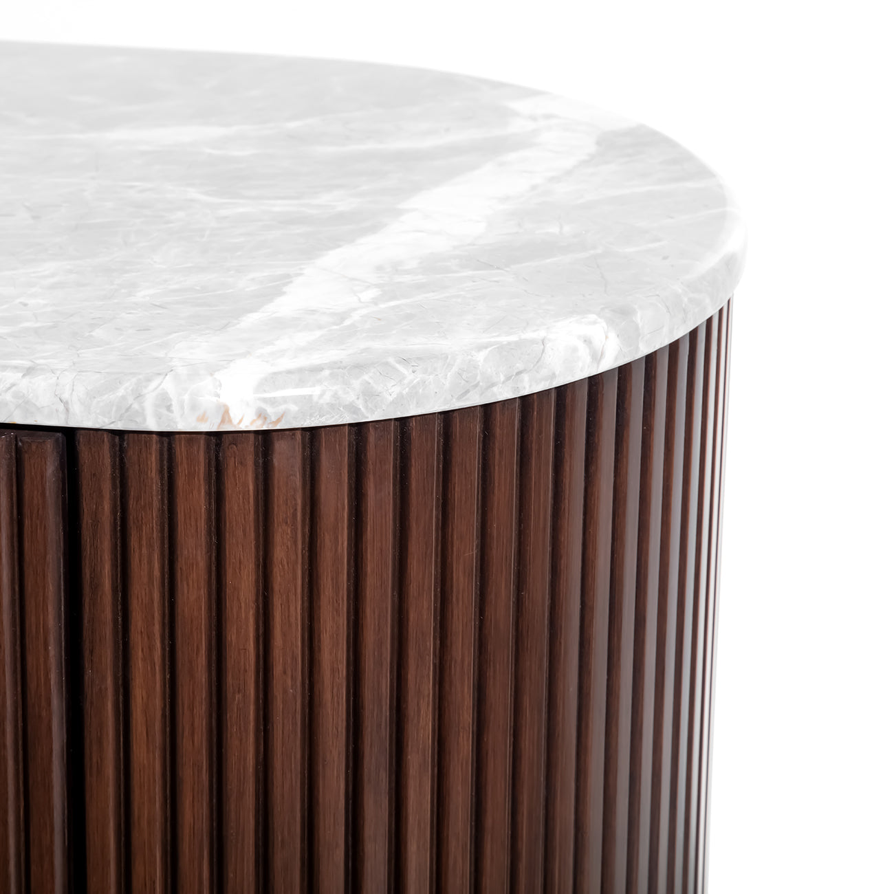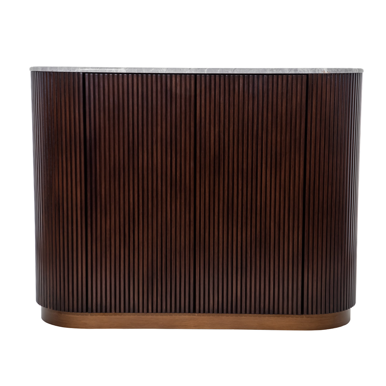 With its sculpted form and material depth, the Whitwell Two Door Cabinet brings architectural balance to living and dining spaces. The pebble grey marble top is softly honed to reveal natural veining, with each piece showcasing subtle variations in tone and pattern. Below, a fluted rubberwood façade in rich walnut conceals two push-to-open doors for a seamless profile. An antique brass-finished plinth adds quiet gleam and lift, while internal shelving offers practical storage. Explore the full Whitwell collection, including a Coffee Table, Dining Table, Bedside, Three Drawer Chest, Desk and Console Table. W110 x D40 x H85 cm.