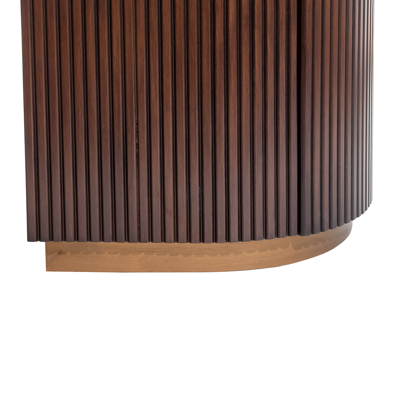 The Whitwell Desk offers a refined workspace with sculptural presence. Its gently rounded top is crafted from pebble grey marble, softly honed and naturally varied in tone and veining. The twin pedestal base is constructed from solid rubberwood, fluted and finished in a rich walnut tone to highlight the grain. Four drawers and two cupboards provide discreet storage, each fitted with slim antique brass handles that echo the matching plinth detail. Both practical and poised, this piece brings a considered finish to office or dressing spaces. Explore the full Whitwell collection, including a Coffee Table, Two Door Cabinet, Dining Table, Bedside, Three Drawer Chest and Console Table. W142 x D45 x H79.5 cm. Drawer size W24.5 x D35 x H12cm