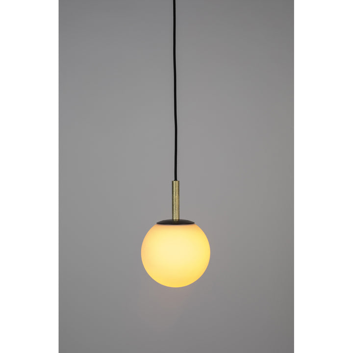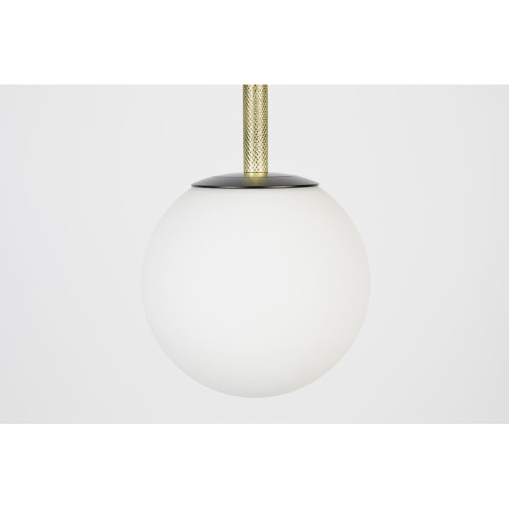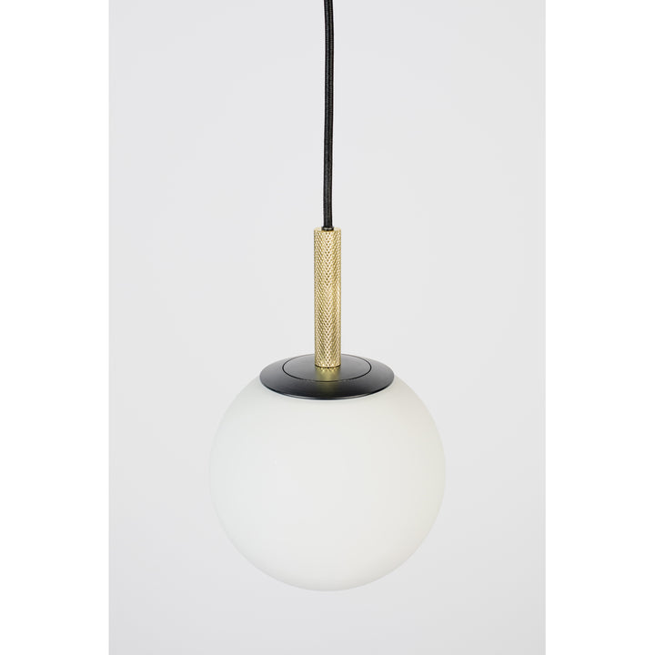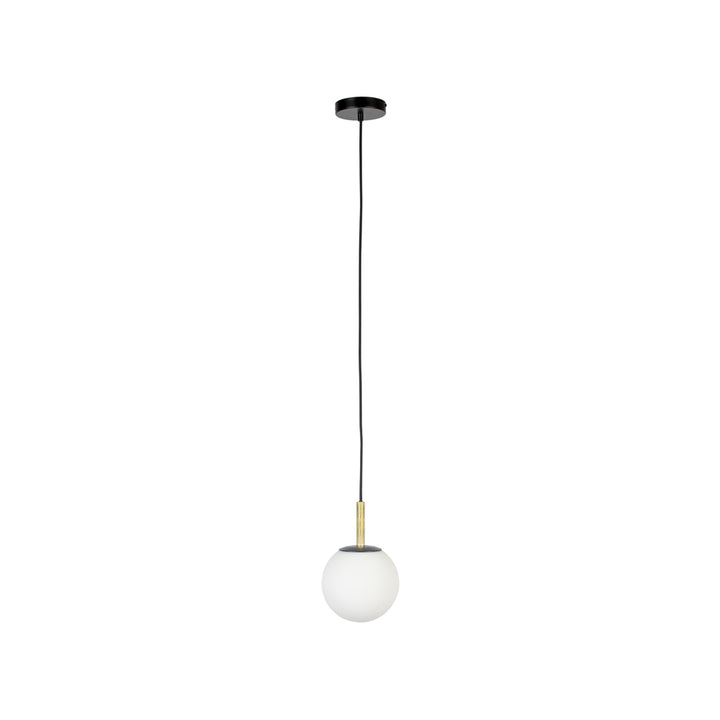 The Orion pendant is a fine complement to any home environment. A perfect sphere of opal glass hangs low on a black cotton fabric cable suspended from a black painted iron rose.
